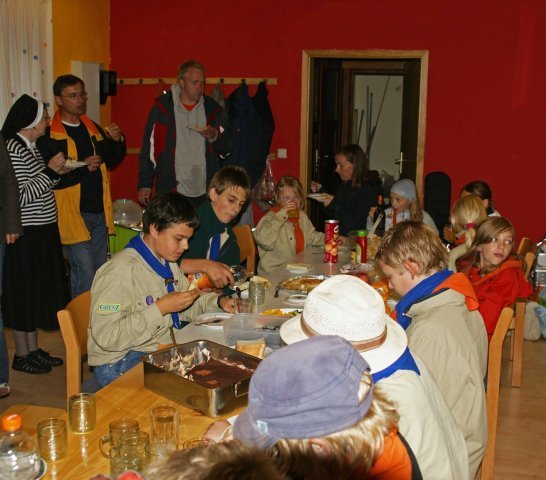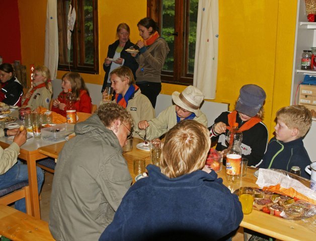 Am vergangenen Freitag, am 12.6.09, war bei den Greifswalder Pfadfindern der DPSG (deutsche Pfadfinderschaft Sankt Georg) ein großes Fest. Dort fanden zwei Umstufungen, sieben Versprechen und vier Aufnahmen statt. Zu Anfang wurde im Regen eine Jumbo-Jurte aufgebaut. (Es gibt fünf typische Pfadfinderzelte. Hier der Größe nach von klein bis groß aufgelistet: Kröte, Lokomotive, Kohte, Weißzelt [klein], Jurte, Jumbo-Jurte und Weißzelt [groß].) Im Pfadiheim wurde derweil ein Buffet errichtet. Danach kamen alle in der Jumbo-Jurte zusammen um das Lied „Flinke Hände, Flinke Füße“ zu singen. Nun mußte jeder, der sein Versprechen ablegen wollte, Fragen beantworten. Dazu wurden zwei Mannschaften gebildet. Am Ende wußte doch jedes Team die Fragen richtig zu beantworten. Jeder der sein Versprechen ablegen wollte, hatte sich eines ausgedacht, mußte eines nachsprechen oder zumindest alle dort vorkommenden Kriterien bestätigen. Dann wurde noch das Lied „Heute hier, morgen dort“ gesungen. Nun machten sich alle über das vorbereitete Essen her. Anschließend war noch etwas Zeit zum Spielen, während die Leiter im Haus saßen und Sachen mit den Eltern besprachen. Die ganze Veranstaltung endete um 9:30 Uhr. (Tobias Altripp, 11 Jahre)