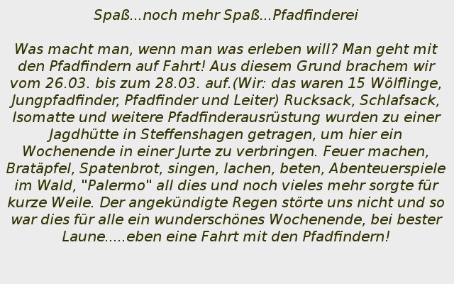 Was macht man, wenn man was erleben will? Man geht mit den Pfadfindern auf Fahrt! Aus diesem Grund brachem wir vom 26.03. bis zum 28.03. auf.(Wir: das waren 15 Wölflinge, Jungpfadfinder, Pfadfinder und Leiter) Rucksack, Schlafsack, Isomatte und weitere Pfadfinderausrüstung wurden zu einer Jagdhütte in Steffenshagen getragen, um hier ein Wochenende in einer Jurte zu verbringen. Feuer machen, Bratäpfel, Spatenbrot, singen, lachen, beten, Abenteuerspiele im Wald, "Palermo" all dies und noch vieles mehr sorgte für kurze Weile. Der angekündigte Regen störte uns nicht und so war dies für alle ein wunderschönes Wochenende, bei bester Laune.....eben eine Fahrt mit den Pfadfindern!