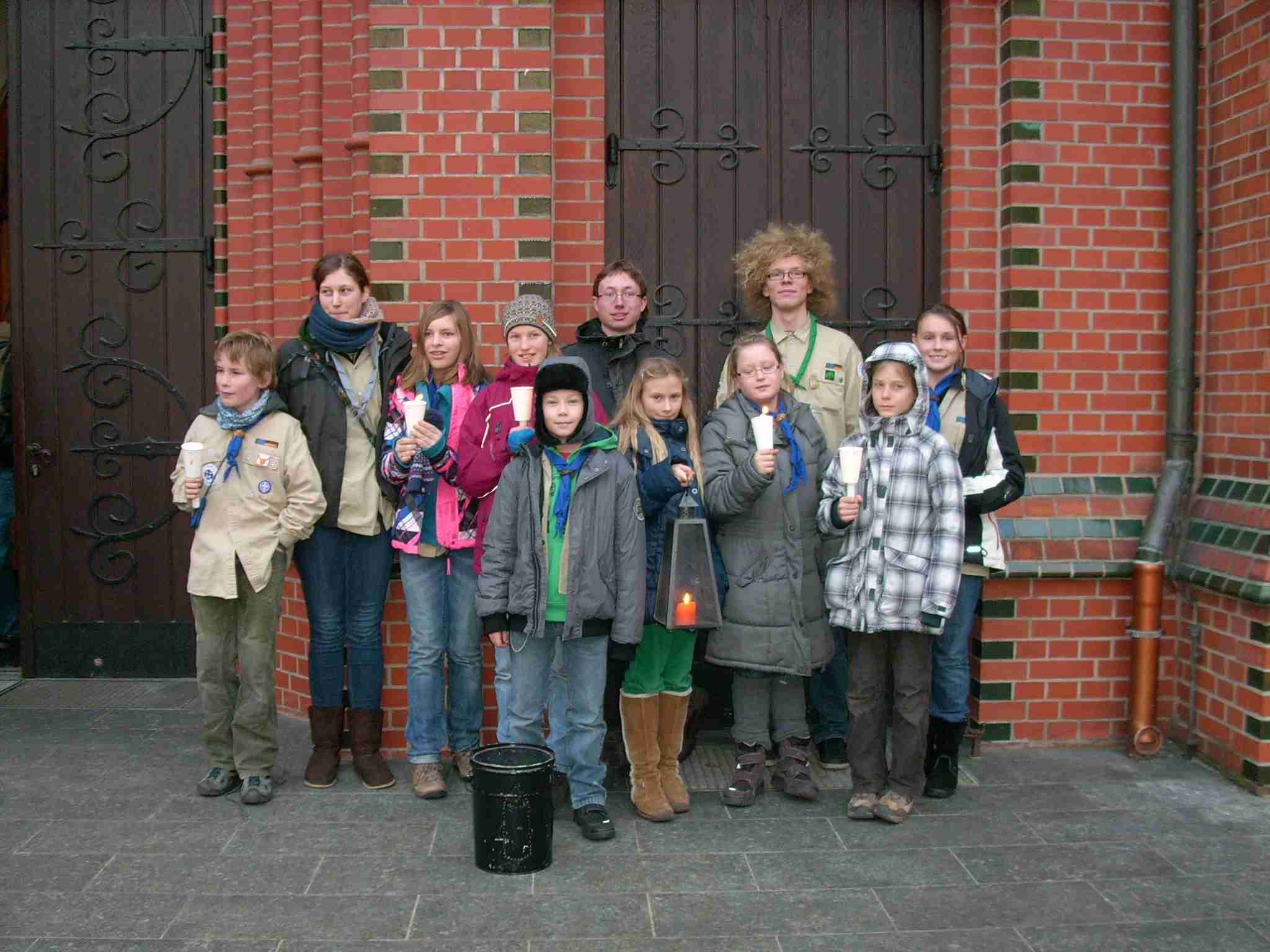 Um das Friedenslicht abzuholen, fuhren aus unserem Stamm elf Pfadfinder und Pfadfinderinnen nach Berlin und holten in der Hauptstadt am 10. und 11. Dezember das Friedenslicht ab. Mit dem Zug ging es nach Berlin. Auf der Fahrt, die vielen lang erschien, spielten wir ein paar Spiele, so dass auch die Zeit schnell vorbei ging. In Berlin angekommen fuhren wir mit der U-Bahn zur Kirchengemeinde St. Dominicus. Hier schlugen wir für die Nacht in dem Pfadfinderkeller unser Lager auf. Zum Abendessen gab es Pizza. Leider spielte der Ofen nicht ganz mit, weshalb es erst sehr spät unsere Mahlzeit gab. Den Abend ließen wir mit ein paar Runden des Spieles "Parlermo" ausklingen. Am nächsten Morgen gingen wir in den Gottesdienst, in welchem wir uns kurz vorgestellt haben. Jetzt begann der lästigste Teil an einer Pfadfinderfahrt: Das Aufräumen. Aber auch das ließ sich von elf mehr oder weniger fleißigen Pfadfindern erledigen und direkt im Anschluss holten wir das Licht ab. Es wäre keine Pfadfinderfahrt gewesen, wenn alles reibungslos ablief. So kam es, dass wir wegen eines Ausfalls einer U-Bahnlinie unseren Zug nach Greifswald verpassten. Doch am Ende wendete sich doch noch alles zum Guten. Mit einigen wenigen Stunden Verspätung kamen wir und die Flamme aus Bethlehem in Greifswald an.